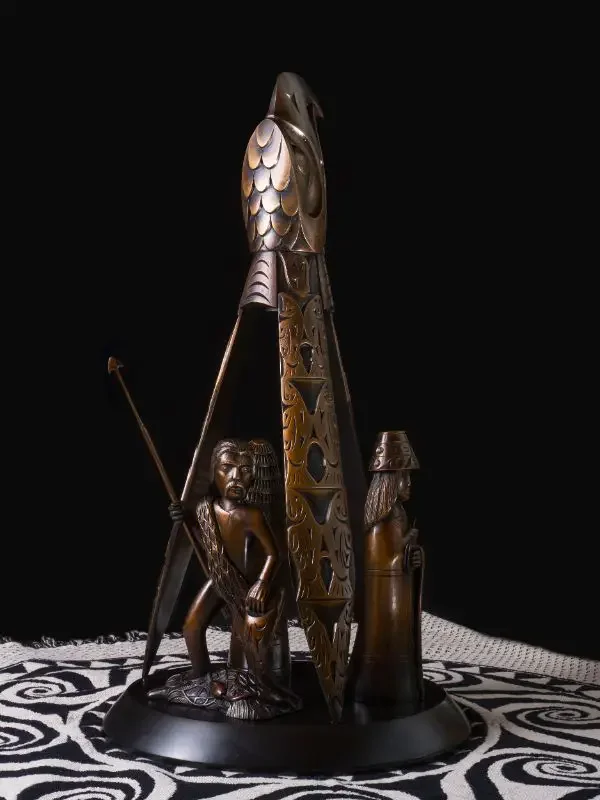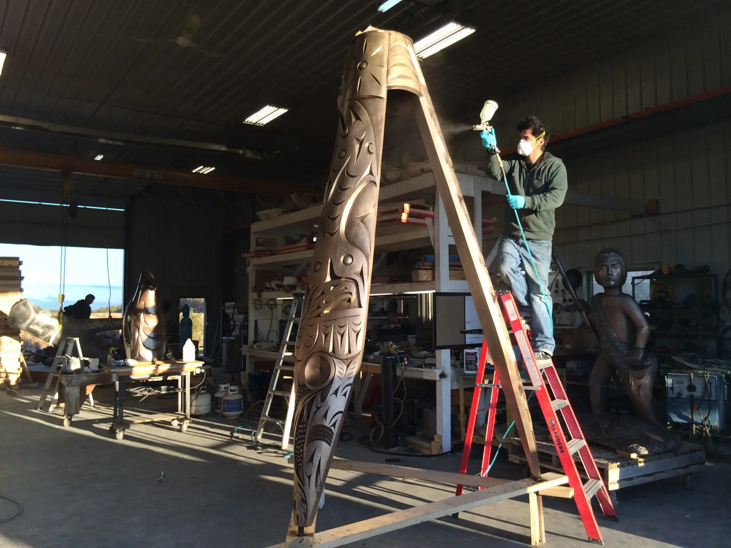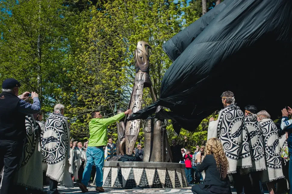 Located in Vancouver’s Stanley Park at the site of Marston’s ancestral village (X̲wáýx̲way), Shore to Shore is a 14-foot bronze-cast sculpture surrounded by engraved Portuguese stone. The work commemorates the adventures of Portuguese adventurer Joe Silvey (“Portuguese Joe”) as well as his first and second Coast Salish wives Khaltinaht and Kwatleemaat – Portuguese Joe and Kwatleemaat are the artist’s great-great-grandparents.