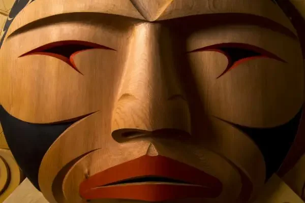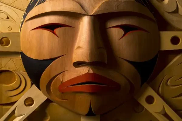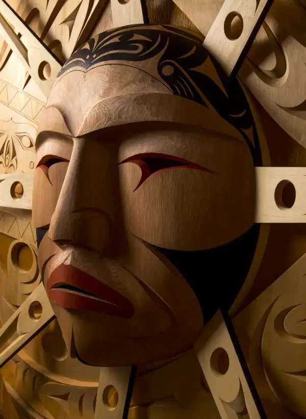 Carved in 2016, Luke Marston’s Sun panel references the legend of a young man who traded his feather blanket to the sun in exchange for a wool blanket. Each time he took a strand of wool from this blanket and placed it into the river, the strand would transform into thousands of salmon.